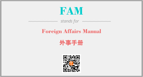 上述内容是“Foreign Affairs Manual”作为“FAM”的缩写,解释为“外事手册”时的信息,以及英文缩略词FAM所代表的英文单词,其对应的中文拼音、详细解释以及在英文中的流行度和相关分类、应用领域及应用示例等。
