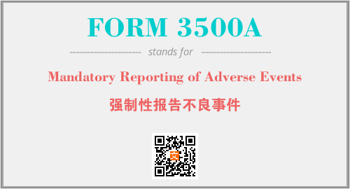 上述内容是“Mandatory Reporting of Adverse Events”作为“FORM 3500A”的缩写,解释为“强制性报告不良事件”时的信息,以及英文缩略词FORM 3500A所代表的英文单词,其对应的中文拼音、详细解释以及在英文中的流行度和相关分类、应用领域及应用示例等。