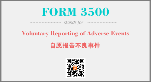 上述内容是“Voluntary Reporting of Adverse Events”作为“FORM 3500”的缩写,解释为“自愿报告不良事件”时的信息,以及英文缩略词FORM 3500所代表的英文单词,其对应的中文拼音、详细解释以及在英文中的流行度和相关分类、应用领域及应用示例等。