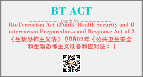 以上为BioTerrorism Act (Public Health Security and Bioterrorism Preparedness and Response Act of 2002)英文缩略词BT ACT的中文解释,以及该英文缩写在英语的流行度、分类和应用领域方面的信息。