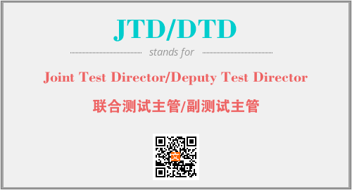 上述内容是“Joint Test Director/Deputy Test Director”作为“JTD/DTD”的缩写,解释为“联合测试主管/副测试主管”时的信息,以及英文缩略词JTD/DTD所代表的英文单词,其对应的中文拼音、详细解释以及在英文中的流行度和相关分类、应用领域及应用示例等。