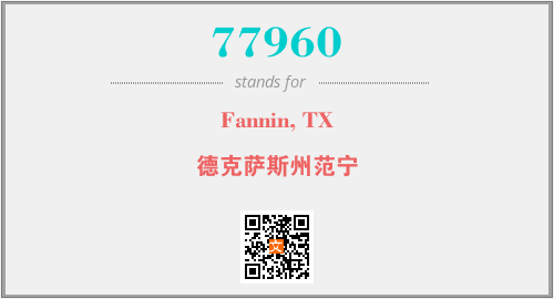 上述内容是“Fannin, TX”作为“77960”的缩写,解释为“德克萨斯州范宁”时的信息,以及英文缩略词77960所代表的英文单词,其对应的中文拼音、详细解释以及在英文中的流行度和相关分类、应用领域及应用示例等。