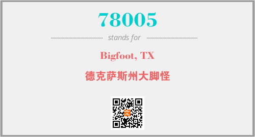 上述内容是“Bigfoot, TX”作为“78005”的缩写,解释为“德克萨斯州大脚怪”时的信息,以及英文缩略词78005所代表的英文单词,其对应的中文拼音、详细解释以及在英文中的流行度和相关分类、应用领域及应用示例等。
