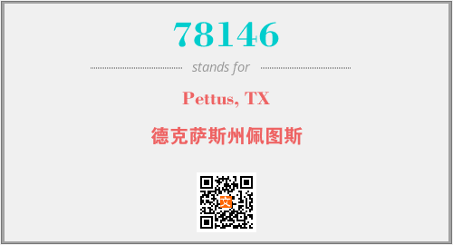 上述内容是“Pettus, TX”作为“78146”的缩写,解释为“德克萨斯州佩图斯”时的信息,以及英文缩略词78146所代表的英文单词,其对应的中文拼音、详细解释以及在英文中的流行度和相关分类、应用领域及应用示例等。