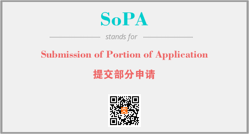 上述内容是“Submission of Portion of Application”作为“SoPA”的缩写,解释为“提交部分申请”时的信息,以及英文缩略词SoPA所代表的英文单词,其对应的中文拼音、详细解释以及在英文中的流行度和相关分类、应用领域及应用示例等。