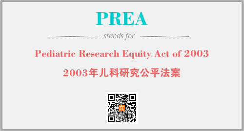 上述内容是“Pediatric Research Equity Act of 2003”作为“PREA”的缩写,解释为“2003年儿科研究公平法案”时的信息,以及英文缩略词PREA所代表的英文单词,其对应的中文拼音、详细解释以及在英文中的流行度和相关分类、应用领域及应用示例等。