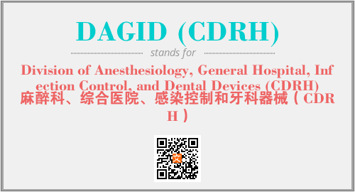 上述内容是“Division of Anesthesiology, General Hospital, Infection Control, and Dental Devices (CDRH)”作为“DAGID (CDRH)”的缩写,解释为“麻醉科、综合医院、感染控制和牙科器械(CDRH)”时的信息,以及英文缩略词DAGID (CDRH)所代表的英文单词,其对应的中文拼音、详细解释以及在英文中的流行度和相关分类、应用领域及应用示例等。
