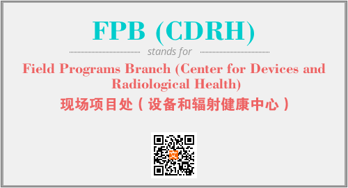 英文缩略词“FPB (CDRH)”经常作为“Field Programs Branch (Center for Devices and Radiological Health)”的英文缩写来使用,中文表示:“现场项目处(设备和辐射健康中心)”。本文将详细介绍英文缩写词FPB (CDRH)所代表英文单词,其对应的中文拼音、详细解释以及在英语中的流行度。此外,还有关于缩略词FPB (CDRH)的分类、应用领域及相关应用示例等。
