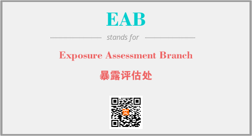 上述内容是“Exposure Assessment Branch”作为“EAB”的缩写,解释为“暴露评估处”时的信息,以及英文缩略词EAB所代表的英文单词,其对应的中文拼音、详细解释以及在英文中的流行度和相关分类、应用领域及应用示例等。