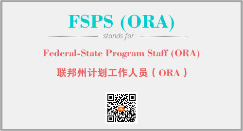 上述内容是“Federal-State Program Staff (ORA)”作为“FSPS (ORA)”的缩写,解释为“联邦州计划工作人员(ORA)”时的信息,以及英文缩略词FSPS (ORA)所代表的英文单词,其对应的中文拼音、详细解释以及在英文中的流行度和相关分类、应用领域及应用示例等。