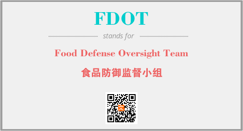 英文缩略词“FDOT”经常作为“Food Defense Oversight Team”的英文缩写来使用,中文表示:“食品防御监督小组”。本文将详细介绍英文缩写词FDOT所代表英文单词,其对应的中文拼音、详细解释以及在英语中的流行度。此外,还有关于缩略词FDOT的分类、应用领域及相关应用示例等。