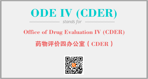英文缩略词“ODE IV (CDER)”经常作为“Office of Drug Evaluation IV (CDER)”的英文缩写来使用,中文表示:“药物评价四办公室(CDER)”。本文将详细介绍英文缩写词ODE IV (CDER)所代表英文单词,其对应的中文拼音、详细解释以及在英语中的流行度。此外,还有关于缩略词ODE IV (CDER)的分类、应用领域及相关应用示例等。