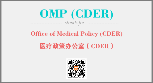 上述内容是“Office of Medical Policy (CDER)”作为“OMP (CDER)”的缩写,解释为“医疗政策办公室(CDER)”时的信息,以及英文缩略词OMP (CDER)所代表的英文单词,其对应的中文拼音、详细解释以及在英文中的流行度和相关分类、应用领域及应用示例等。