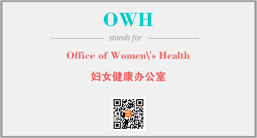 上述内容是“Office of Women\'s Health”作为“OWH”的缩写,解释为“妇女健康办公室”时的信息,以及英文缩略词OWH所代表的英文单词,其对应的中文拼音、详细解释以及在英文中的流行度和相关分类、应用领域及应用示例等。