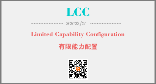英文缩略词“LCC”经常作为“Limited Capability Configuration”的英文缩写来使用,中文表示:“有限能力配置”。本文将详细介绍英文缩写词LCC所代表英文单词,其对应的中文拼音、详细解释以及在英语中的流行度。此外,还有关于缩略词LCC的分类、应用领域及相关应用示例等。
