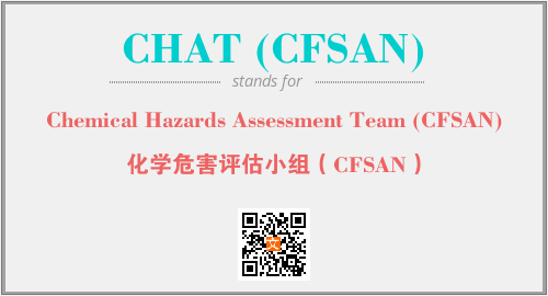 上述内容是“Chemical Hazards Assessment Team (CFSAN)”作为“CHAT (CFSAN)”的缩写,解释为“化学危害评估小组(CFSAN)”时的信息,以及英文缩略词CHAT (CFSAN)所代表的英文单词,其对应的中文拼音、详细解释以及在英文中的流行度和相关分类、应用领域及应用示例等。