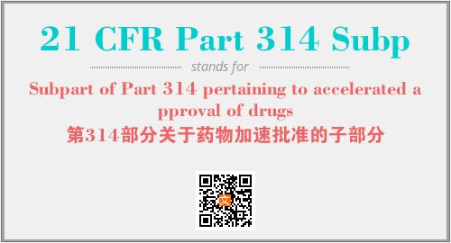 上述内容是“Subpart of Part 314 pertaining to accelerated approval of drugs”作为“21 CFR Part 314 Subp”的缩写,解释为“第314部分关于药物加速批准的子部分”时的信息,以及英文缩略词21 CFR Part 314 Subp所代表的英文单词,其对应的中文拼音、详细解释以及在英文中的流行度和相关分类、应用领域及应用示例等。