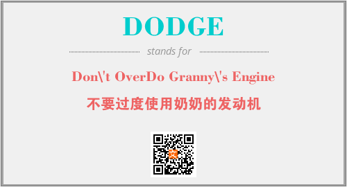 上述内容是“Don\'t OverDo Granny\'s Engine”作为“DODGE”的缩写,解释为“不要过度使用奶奶的发动机”时的信息,以及英文缩略词DODGE所代表的英文单词,其对应的中文拼音、详细解释以及在英文中的流行度和相关分类、应用领域及应用示例等。