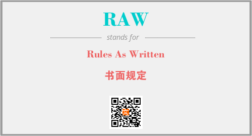 英文缩略词“RAW”经常作为“Rules As Written”的英文缩写来使用,中文表示:“书面规定”。本文将详细介绍英文缩写词RAW所代表英文单词,其对应的中文拼音、详细解释以及在英语中的流行度。此外,还有关于缩略词RAW的分类、应用领域及相关应用示例等。