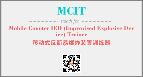 英文缩略词“MCIT”经常作为“Mobile Counter IED (Improvised Explosive Device) Trainer”的英文缩写来使用,中文表示:“移动式反简易爆炸装置训练器”。本文将详细介绍英文缩写词MCIT所代表英文单词,其对应的中文拼音、详细解释以及在英语中的流行度。此外,还有关于缩略词MCIT的分类、应用领域及相关应用示例等。
