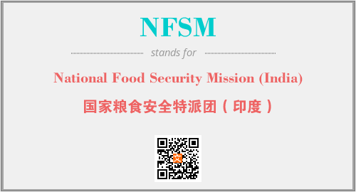 上述内容是“National Food Security Mission (India)”作为“NFSM”的缩写,解释为“国家粮食安全特派团(印度)”时的信息,以及英文缩略词NFSM所代表的英文单词,其对应的中文拼音、详细解释以及在英文中的流行度和相关分类、应用领域及应用示例等。