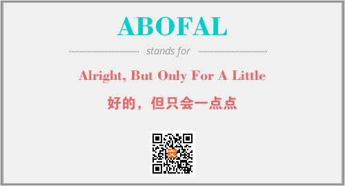 上述内容是“Alright, But Only For A Little”作为“ABOFAL”的缩写,解释为“好的,但只会一点点”时的信息,以及英文缩略词ABOFAL所代表的英文单词,其对应的中文拼音、详细解释以及在英文中的流行度和相关分类、应用领域及应用示例等。