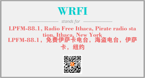 上述内容是“LPFM-88.1, Radio Free Ithaca, Pirate radio station, Ithaca, New York”作为“WRFI”的缩写,解释为“LPFM-88.1,免费伊萨卡电台,海盗电台,伊萨卡,纽约”时的信息,以及英文缩略词WRFI所代表的英文单词,其对应的中文拼音、详细解释以及在英文中的流行度和相关分类、应用领域及应用示例等。
