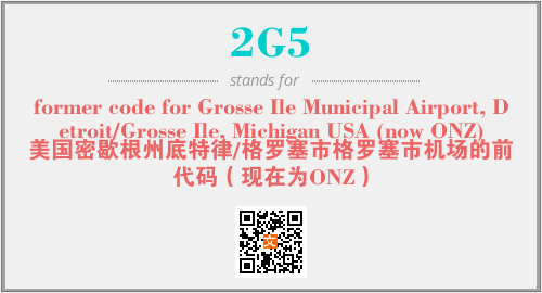 上述内容是“former code for Grosse Ile Municipal Airport, Detroit/Grosse Ile, Michigan USA (now ONZ)”作为“2G5”的缩写,解释为“美国密歇根州底特律/格罗塞市格罗塞市机场的前代码(现在为ONZ)”时的信息,以及英文缩略词2G5所代表的英文单词,其对应的中文拼音、详细解释以及在英文中的流行度和相关分类、应用领域及应用示例等。