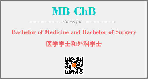 英文缩略词“MB ChB”经常作为“Bachelor of Medicine and Bachelor of Surgery”的英文缩写来使用,中文表示:“医学学士和外科学士”。本文将详细介绍英文缩写词MB ChB所代表英文单词,其对应的中文拼音、详细解释以及在英语中的流行度。此外,还有关于缩略词MB ChB的分类、应用领域及相关应用示例等。