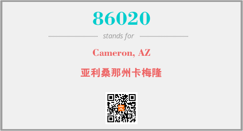 上述内容是“Cameron, AZ”作为“86020”的缩写,解释为“亚利桑那州卡梅隆”时的信息,以及英文缩略词86020所代表的英文单词,其对应的中文拼音、详细解释以及在英文中的流行度和相关分类、应用领域及应用示例等。