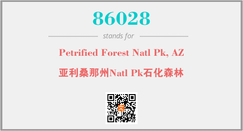 上述内容是“Petrified Forest Natl Pk, AZ”作为“86028”的缩写,解释为“亚利桑那州Natl Pk石化森林”时的信息,以及英文缩略词86028所代表的英文单词,其对应的中文拼音、详细解释以及在英文中的流行度和相关分类、应用领域及应用示例等。