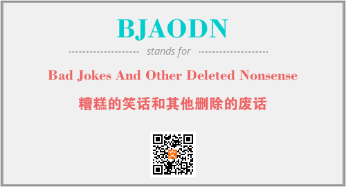 英文缩略词“BJAODN”经常作为“Bad Jokes And Other Deleted Nonsense”的英文缩写来使用,中文表示:“糟糕的笑话和其他删除的废话”。本文将详细介绍英文缩写词BJAODN所代表英文单词,其对应的中文拼音、详细解释以及在英语中的流行度。此外,还有关于缩略词BJAODN的分类、应用领域及相关应用示例等。