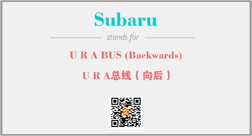 上述内容是“U R A BUS (Backwards)”作为“Subaru”的缩写,解释为“U R A总线(向后)”时的信息,以及英文缩略词Subaru所代表的英文单词,其对应的中文拼音、详细解释以及在英文中的流行度和相关分类、应用领域及应用示例等。