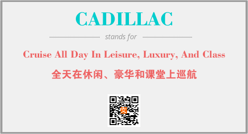 上述内容是“Cruise All Day In Leisure, Luxury, And Class”作为“CADILLAC”的缩写,解释为“全天在休闲、豪华和课堂上巡航”时的信息,以及英文缩略词CADILLAC所代表的英文单词,其对应的中文拼音、详细解释以及在英文中的流行度和相关分类、应用领域及应用示例等。