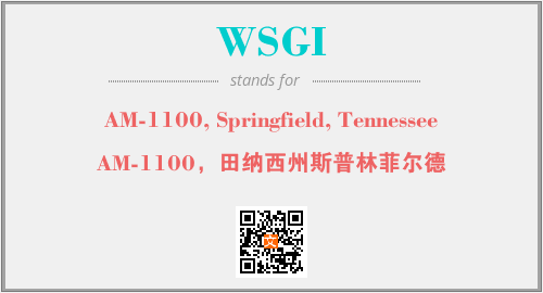上述内容是“AM-1100, Springfield, Tennessee”作为“WSGI”的缩写,解释为“AM-1100,田纳西州斯普林菲尔德”时的信息,以及英文缩略词WSGI所代表的英文单词,其对应的中文拼音、详细解释以及在英文中的流行度和相关分类、应用领域及应用示例等。