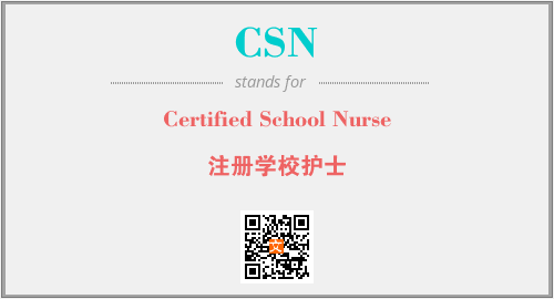上述内容是“Certified School Nurse”作为“CSN”的缩写,解释为“注册学校护士”时的信息,以及英文缩略词CSN所代表的英文单词,其对应的中文拼音、详细解释以及在英文中的流行度和相关分类、应用领域及应用示例等。