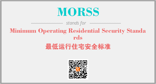 英文缩略词“MORSS”经常作为“Minimum Operating Residential Security Standards”的英文缩写来使用,中文表示:“最低运行住宅安全标准”。本文将详细介绍英文缩写词MORSS所代表英文单词,其对应的中文拼音、详细解释以及在英语中的流行度。此外,还有关于缩略词MORSS的分类、应用领域及相关应用示例等。