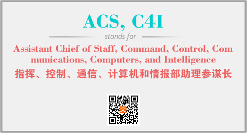 上述内容是“Assistant Chief of Staff, Command, Control, Communications, Computers, and Intelligence”作为“ACS, C4I”的缩写,解释为“指挥、控制、通信、计算机和情报部助理参谋长”时的信息,以及英文缩略词ACS, C4I所代表的英文单词,其对应的中文拼音、详细解释以及在英文中的流行度和相关分类、应用领域及应用示例等。