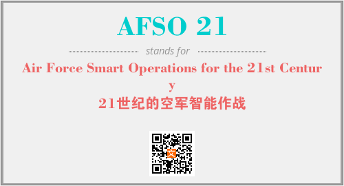 英文缩略词“AFSO 21”经常作为“Air Force Smart Operations for the 21st Century”的英文缩写来使用,中文表示:“21世纪的空军智能作战”。本文将详细介绍英文缩写词AFSO 21所代表英文单词,其对应的中文拼音、详细解释以及在英语中的流行度。此外,还有关于缩略词AFSO 21的分类、应用领域及相关应用示例等。