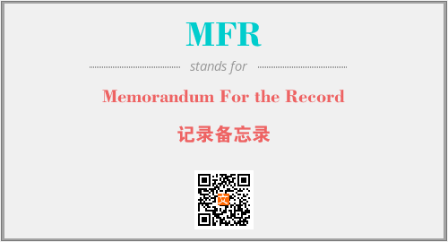 上述内容是“Memorandum For the Record”作为“MFR”的缩写,解释为“记录备忘录”时的信息,以及英文缩略词MFR所代表的英文单词,其对应的中文拼音、详细解释以及在英文中的流行度和相关分类、应用领域及应用示例等。