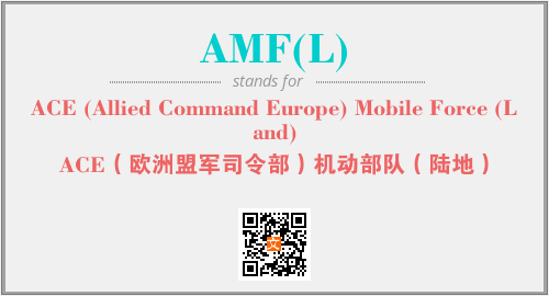英文缩略词“AMF(L)”经常作为“ACE (Allied Command Europe) Mobile Force (Land)”的英文缩写来使用,中文表示:“ACE(欧洲盟军司令部)机动部队(陆地)”。本文将详细介绍英文缩写词AMF(L)所代表英文单词,其对应的中文拼音、详细解释以及在英语中的流行度。此外,还有关于缩略词AMF(L)的分类、应用领域及相关应用示例等。