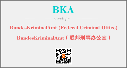 上述内容是“BundesKriminalAmt (Federal Criminal Office)”作为“BKA”的缩写,解释为“BundesKriminalAmt(联邦刑事办公室)”时的信息,以及英文缩略词BKA所代表的英文单词,其对应的中文拼音、详细解释以及在英文中的流行度和相关分类、应用领域及应用示例等。