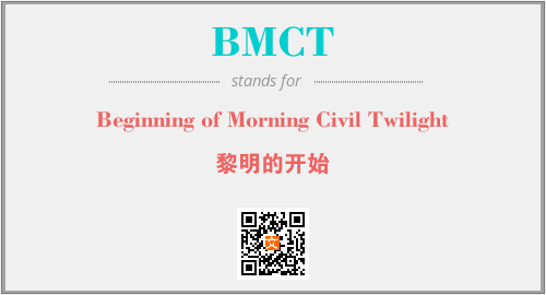英文缩略词“BMCT”经常作为“Beginning of Morning Civil Twilight”的英文缩写来使用,中文表示:“黎明的开始”。本文将详细介绍英文缩写词BMCT所代表英文单词,其对应的中文拼音、详细解释以及在英语中的流行度。此外,还有关于缩略词BMCT的分类、应用领域及相关应用示例等。
