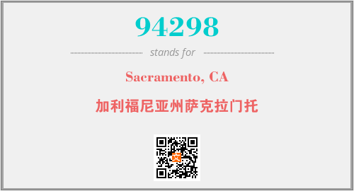 上述内容是“Sacramento, CA”作为“94298”的缩写,解释为“加利福尼亚州萨克拉门托”时的信息,以及英文缩略词94298所代表的英文单词,其对应的中文拼音、详细解释以及在英文中的流行度和相关分类、应用领域及应用示例等。