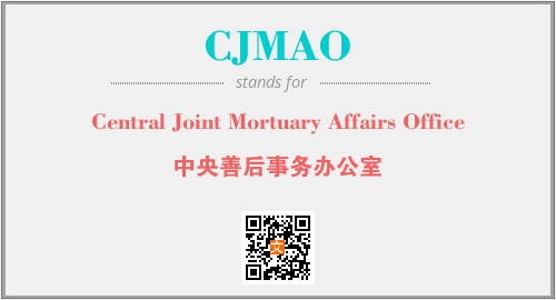 上述内容是“Central Joint Mortuary Affairs Office”作为“CJMAO”的缩写,解释为“中央善后事务办公室”时的信息,以及英文缩略词CJMAO所代表的英文单词,其对应的中文拼音、详细解释以及在英文中的流行度和相关分类、应用领域及应用示例等。