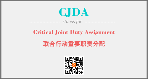 英文缩略词“CJDA”经常作为“Critical Joint Duty Assignment”的英文缩写来使用,中文表示:“联合行动重要职责分配”。本文将详细介绍英文缩写词CJDA所代表英文单词,其对应的中文拼音、详细解释以及在英语中的流行度。此外,还有关于缩略词CJDA的分类、应用领域及相关应用示例等。