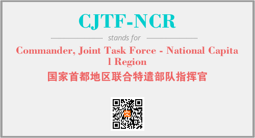 上述内容是“Commander, Joint Task Force - National Capital Region”作为“CJTF-NCR”的缩写,解释为“国家首都地区联合特遣部队指挥官”时的信息,以及英文缩略词CJTF-NCR所代表的英文单词,其对应的中文拼音、详细解释以及在英文中的流行度和相关分类、应用领域及应用示例等。