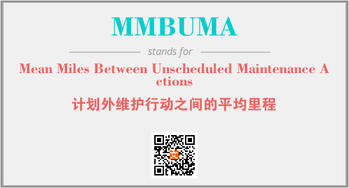 上述内容是“Mean Miles Between Unscheduled Maintenance Actions”作为“MMBUMA”的缩写,解释为“计划外维护行动之间的平均里程”时的信息,以及英文缩略词MMBUMA所代表的英文单词,其对应的中文拼音、详细解释以及在英文中的流行度和相关分类、应用领域及应用示例等。