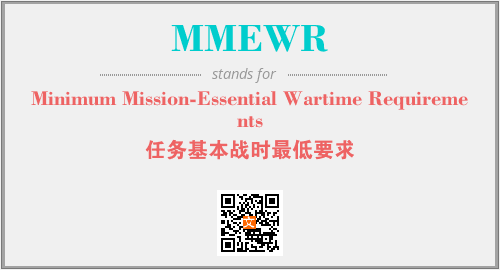 英文缩略词“MMEWR”经常作为“Minimum Mission-Essential Wartime Requirements”的英文缩写来使用,中文表示:“任务基本战时最低要求”。本文将详细介绍英文缩写词MMEWR所代表英文单词,其对应的中文拼音、详细解释以及在英语中的流行度。此外,还有关于缩略词MMEWR的分类、应用领域及相关应用示例等。