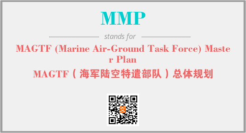 英文缩略词“MMP”经常作为“MAGTF (Marine Air-Ground Task Force) Master Plan”的英文缩写来使用,中文表示:“MAGTF(海军陆空特遣部队)总体规划”。本文将详细介绍英文缩写词MMP所代表英文单词,其对应的中文拼音、详细解释以及在英语中的流行度。此外,还有关于缩略词MMP的分类、应用领域及相关应用示例等。